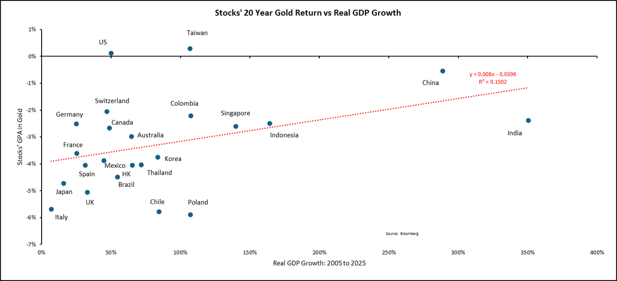 Second, only two stock markets (barely) outperformed gold in the past 20 years: the US and Taiwan, mostly due to the AI / semi bull market.