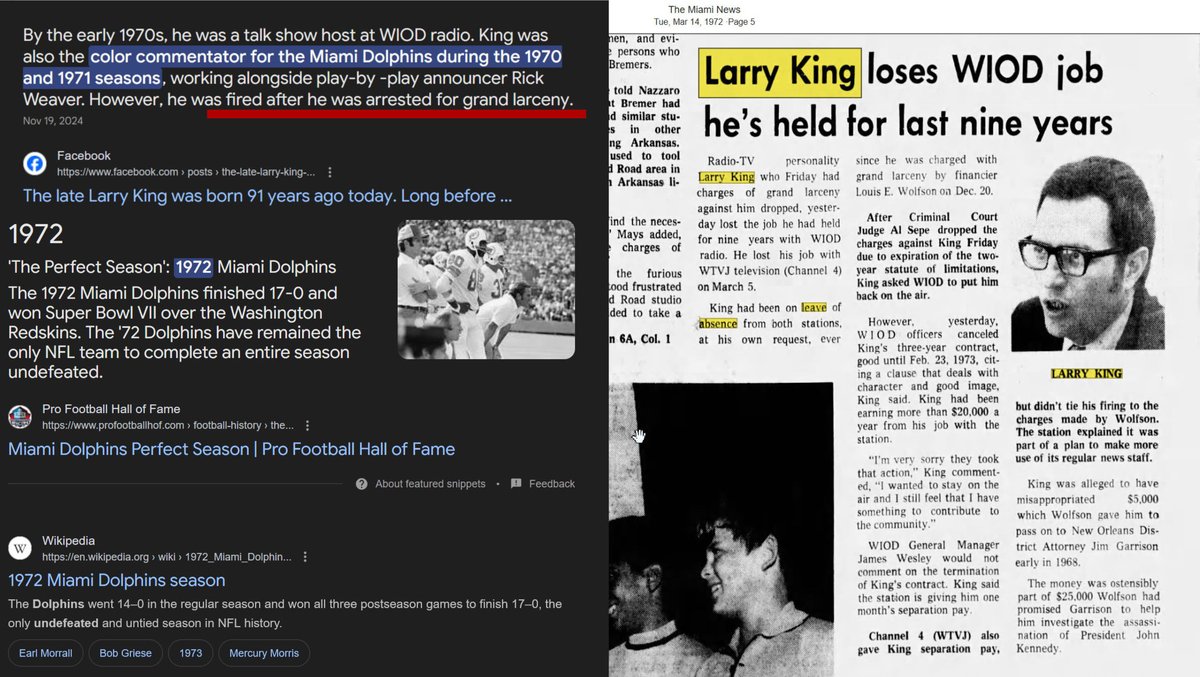 2. What makes it far stranger is Larry King was a color commentator for the Miami Dolphins between 1970-1972 a position he lost due to the arrest.