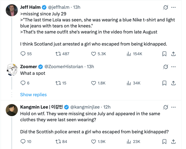 As the news cycle suspiciously and swiftly switched to the latest happening across the pond, more details started to emerge surrounding these enigmatically memetic Scottish girls. A Facebook post reports "Lilly Ruby Moir" missing on July 23, 2023, *one* month before the incident.