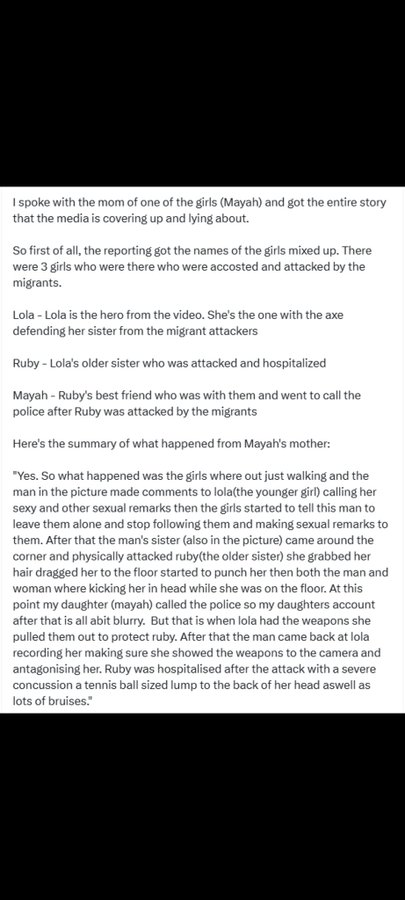 Soon this story began to spread, allegedly from a mother. The girls were being sexually harassed by the Bulgarian man and his "sister". Ruby was assaulted by the couple and taken to the hospital, the friend Mayah called the police, and Lola was the one wielding the axe and knife.