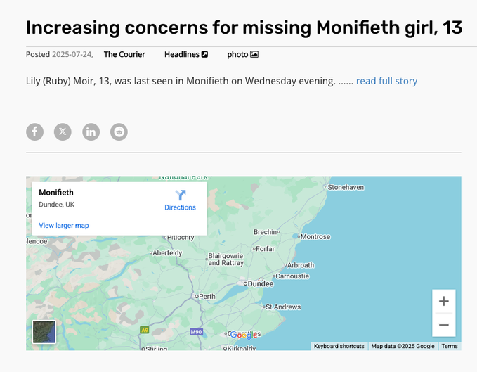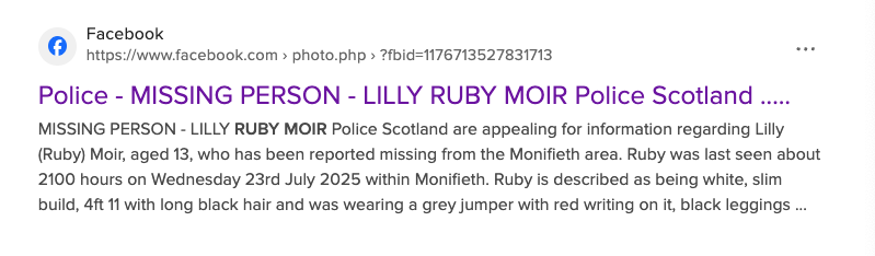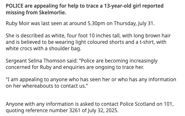 On July 24, one day later, Lily (with one L) Ruby Moir is still cited as missing, with "increasing concerns" for her whereabouts. She is described as a "Monifieth girl" (essentially part of Dundee). This is likely "Ruby", the 13yo older sister of axe girl. article.wn.com/view/2025/07/2…