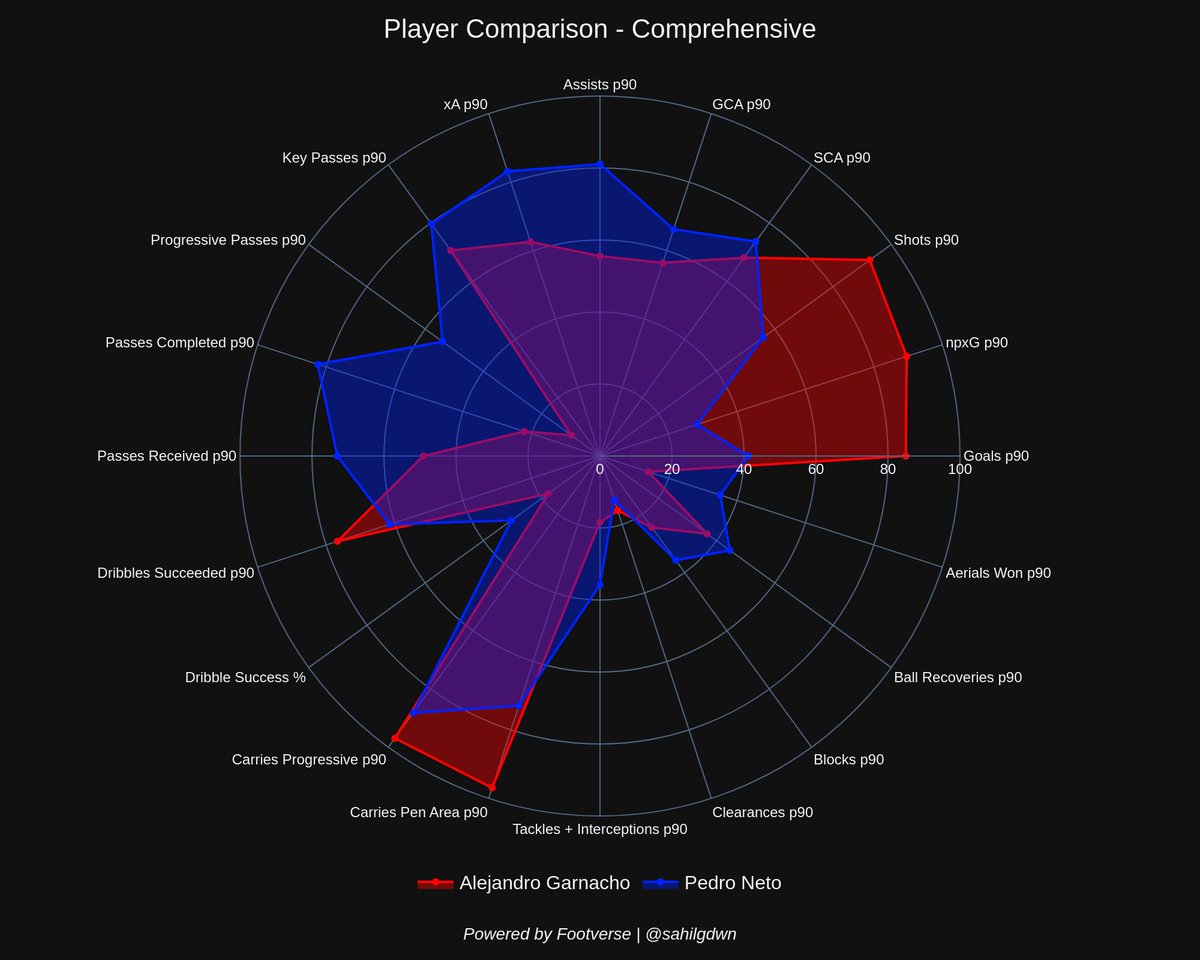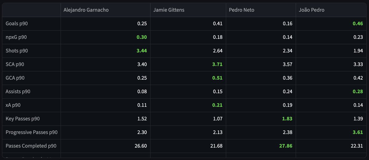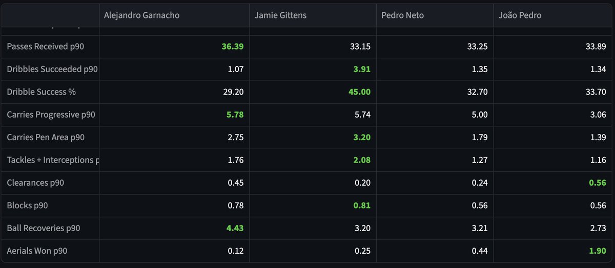 At Chelsea his role makes sense. He profiles most similarly to Madueke, who left for Arsenal, offering directness and goal threat. Neto adds width but lacks Garnacho’s scoring edge, while Gittens is a 1v1 dribbler specialist. Garnacho fits as the hybrid wide threat.