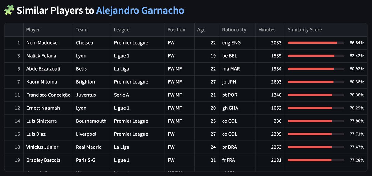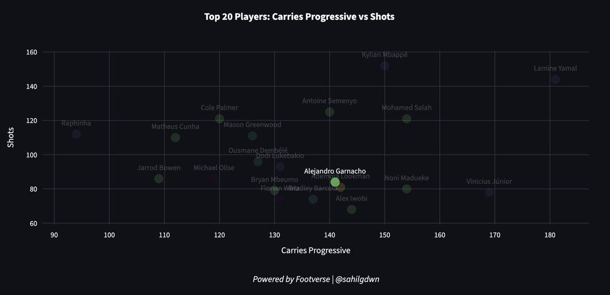 On progressive carries vs shots, Garnacho ranks among the best. Using Footverse’s player clone tool, his closest profiles are Madueke, Fofana, Mitoma and Diaz. Remarkably, he’s been the cheapest move among them despite his ability and ceiling.
