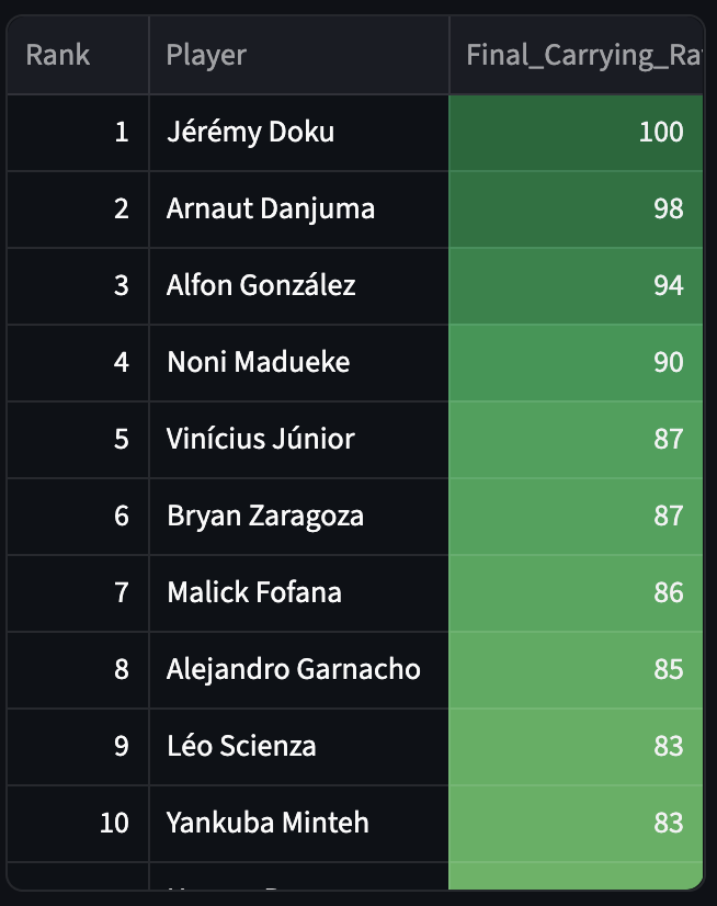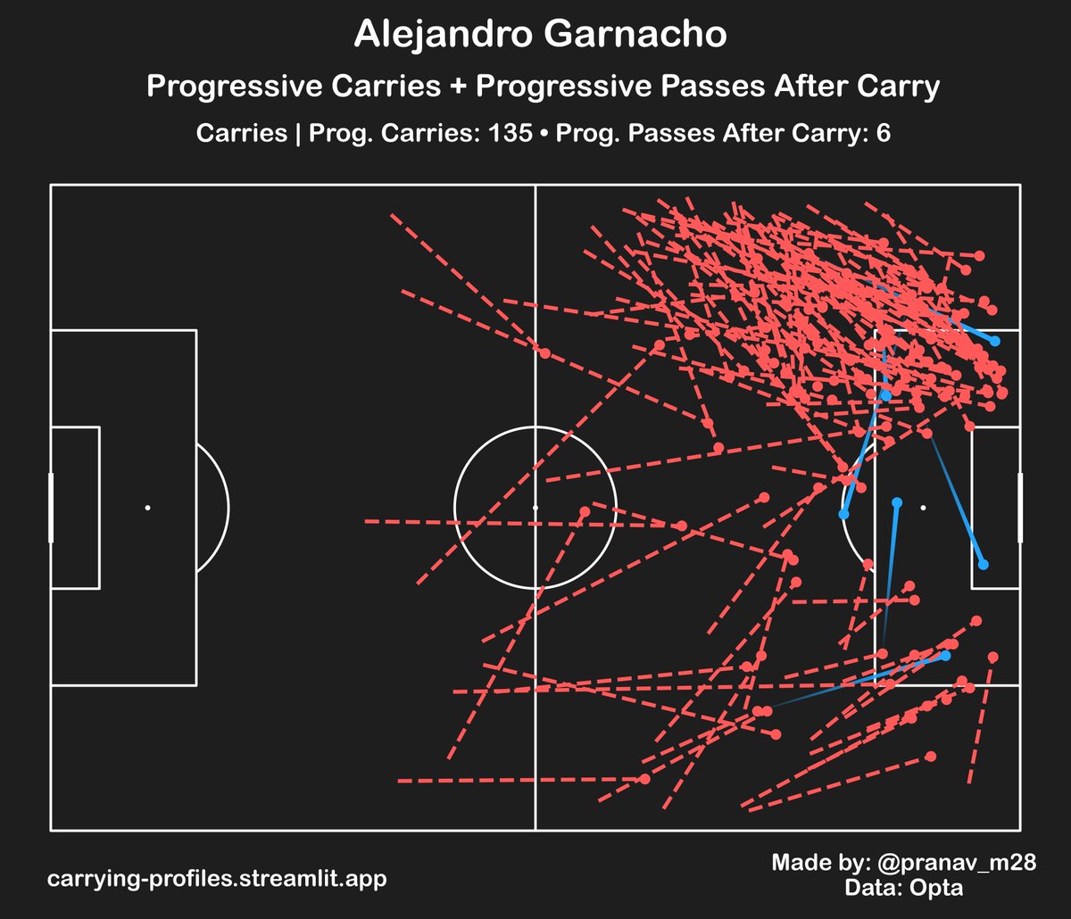 Using my friend @pranav_m28 apps we can dive deeper. On carrying profiles he scores 85/100 ranking 8th behind names like Fofana, Zaragoza and Vinícius. Another viz highlights his strong half-space carrying and tendency to drive forward rather than pass.