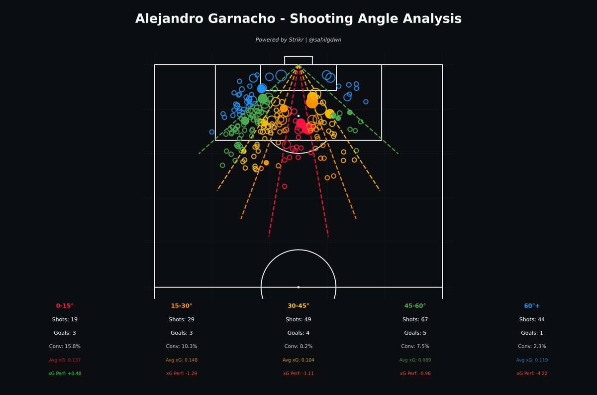Most of his attempts come from low-value areas, with 151 of 208 shots in the 0-0.1 xG range. He’s had only one shot above 0.6xG and missed it. He loves cutting in from the left half-space but angles are too wide and finishing composure remains inconsistent.