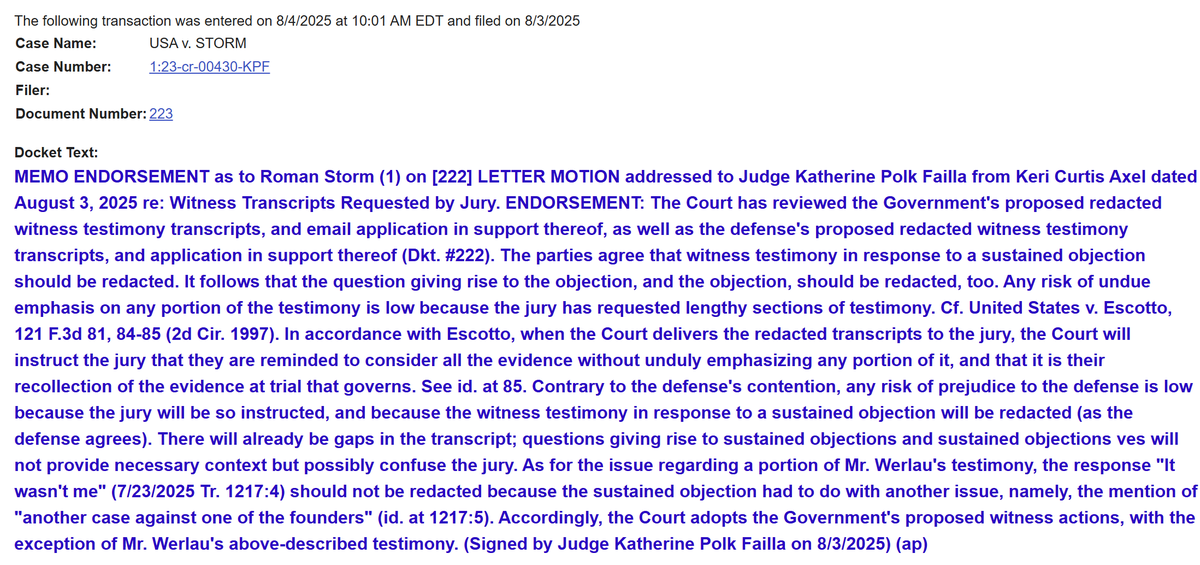 As counsel on both side sit at their table waiting for the next jury note, here's letter that the defense put in about the transcripts jurors have request so far: "transcripts therefore should reflect exactly what the jury heard" - including sealed Dragonfly Q&A?
