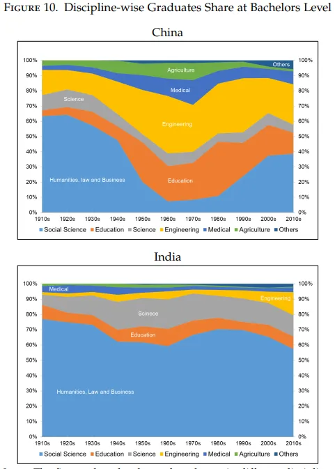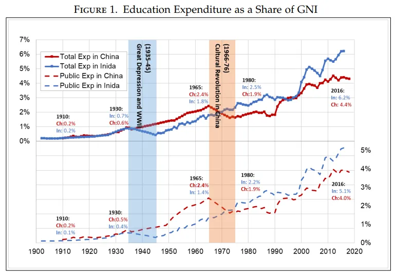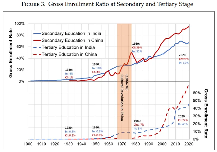 Today we're looking at a piece of this puzzle that generally receives less attention, the different choices we made in developing the human capital of our two countries. A fascinating paper by Nitin Kumar Bharti and Li Yang reveals the story.
