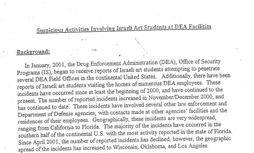 Before 9/11, DEA and FBI offices across the U.S. were reporting the same anomaly, young Israelis with military intelligence backgrounds appearing at secure facilities and agents’ homes, posing as “art students” with cheap canvases.