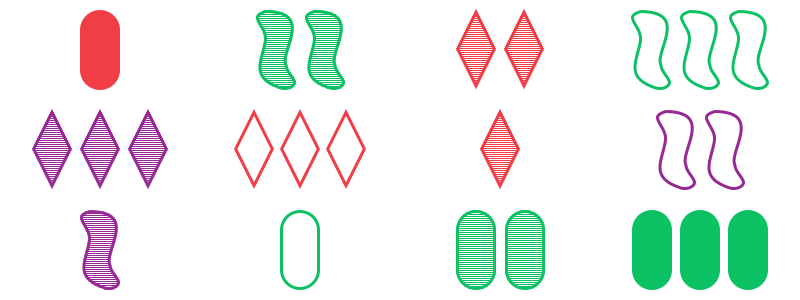 - A valid set is 3 cards where for each, it's either all the same or all different across the 3 cards