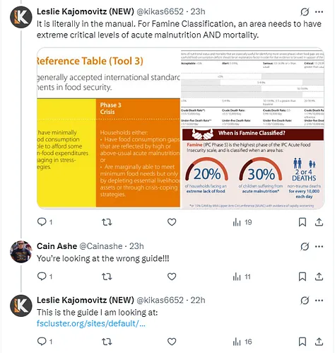 He tried to dismiss the concerns, claiming I hadn’t read the manual and that he helped write it. I flagged the key issue: no evidence of people dying of starvation, required to declare famine. He pointed to another version, same rule repeated, he tried to ignore the core problem