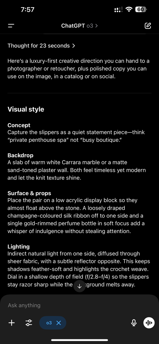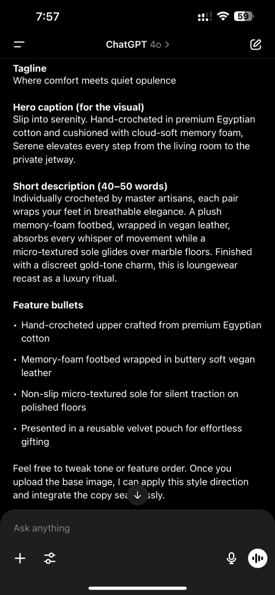 So, I want you to describe the product image style and the copy, and then I will upload the image so you can edit it into that style. Again, the vibe is luxury. The image needs to communicate that luxury, alright?"
