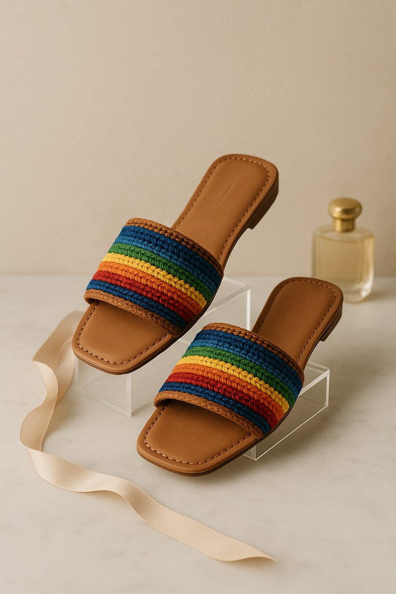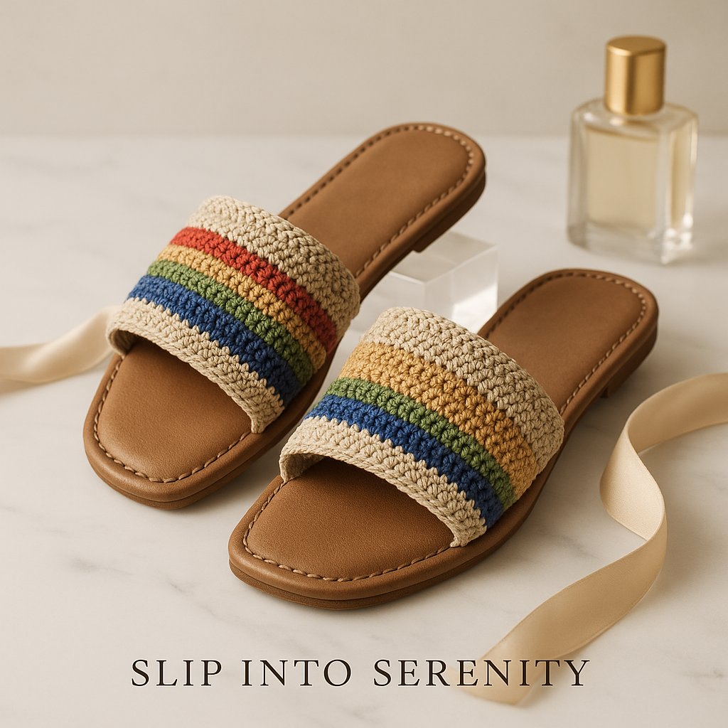 "I want to create a luxurious product image for a crochet slippers for ladies. I have the image of the sandals, but I want to nail the copy first, then we can do the image.