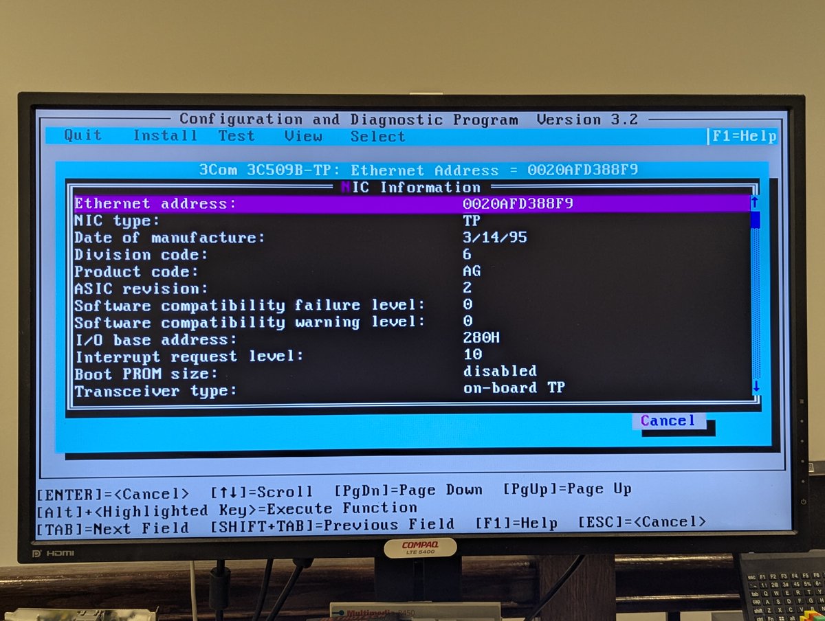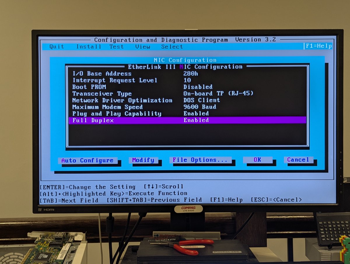 Second, the 3Com Etherlink III card worked in this system after running the setup program and flipping it to a different address (via Plug and Play). I think that maybe my Pacman PCs Ali Express mobo might be flawed, who knows