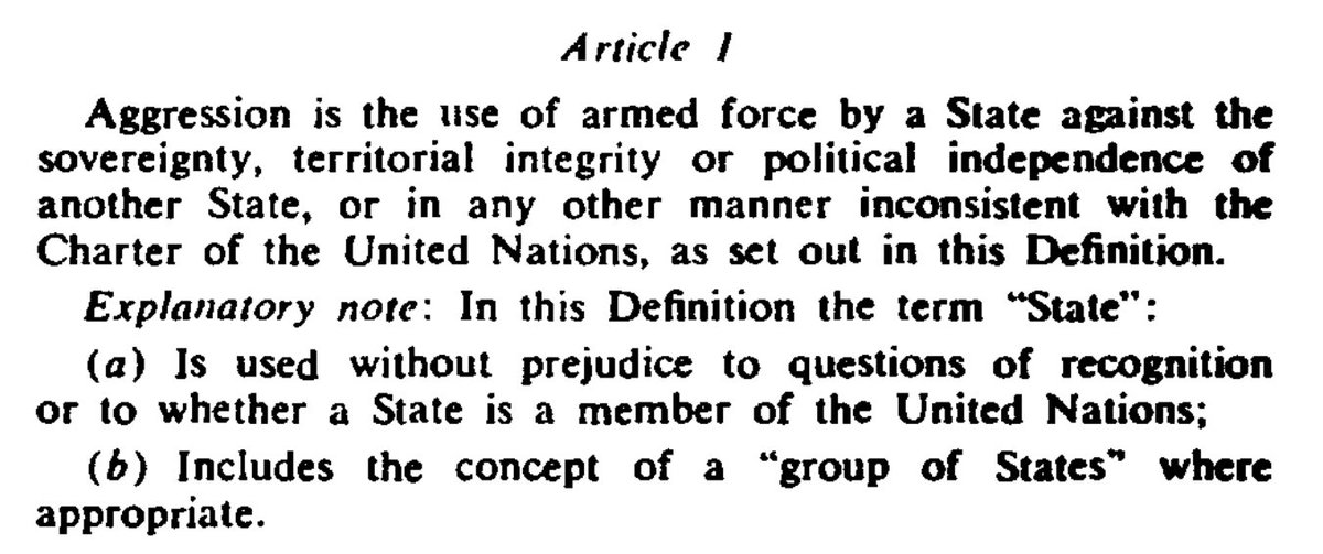 3/4 Aggression is defined by UN General Assembly Resolution 3314 as the the use of armed force by a State - in this case by Israel and the US - against the sovereignty, territorial integrity or political independence of Palestine, including any annexation, appropriation and exploitation of territory by the 'trust.'