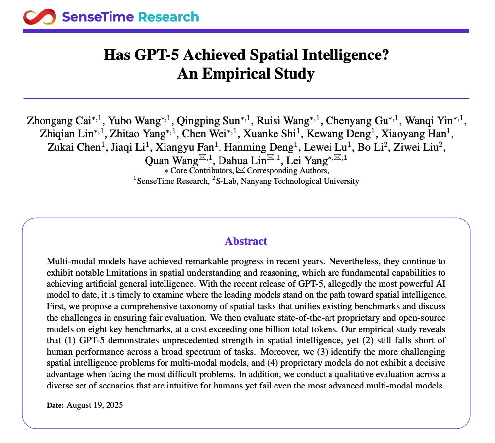 This report introduces a unified view of spatial intelligence (SI) for multimodal models and evaluates GPT‑5 and strong baselines across eight fresh SI benchmarks.