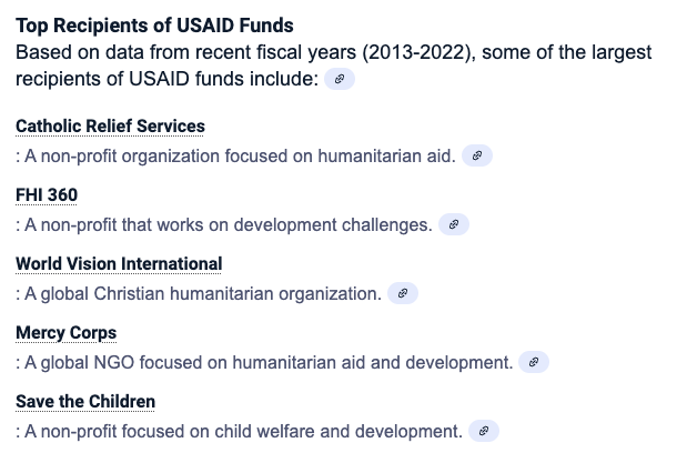 8/Catholic Relief Services tops the list, receiving (until now) $4.6 billion. Save the Children garners $1.5B; WorldVision $1.2B; Mercy Corps $1.1B. In February Trump called the govt USAID workers and these NGOs, “a bunch of radical lunatics.”