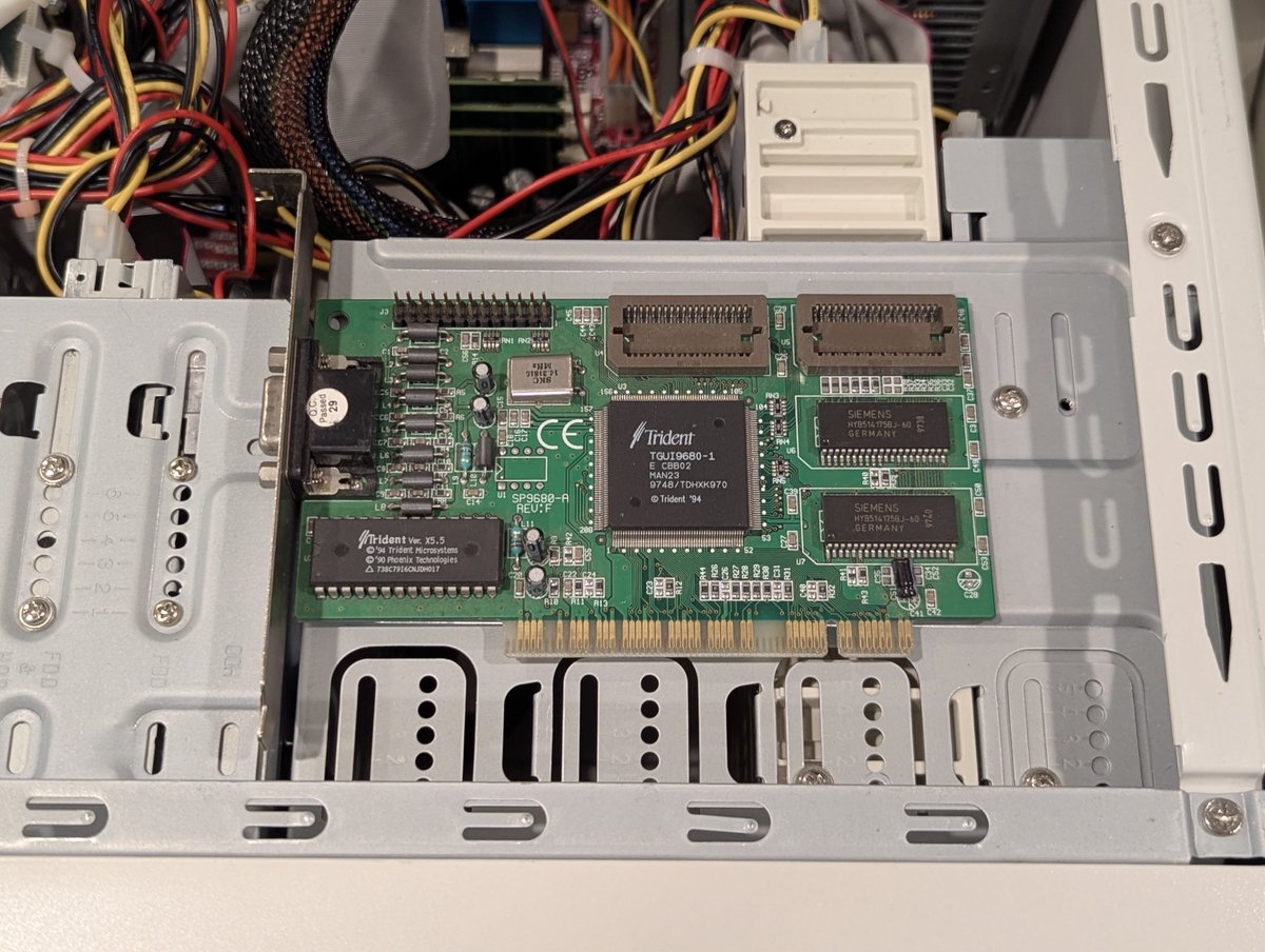 I have two Trident PCI video cards that I had tested in the Foto Fantasy PC. Let's make sure they still work after being in that unstable beast. And indeed they do. Good. Pass.