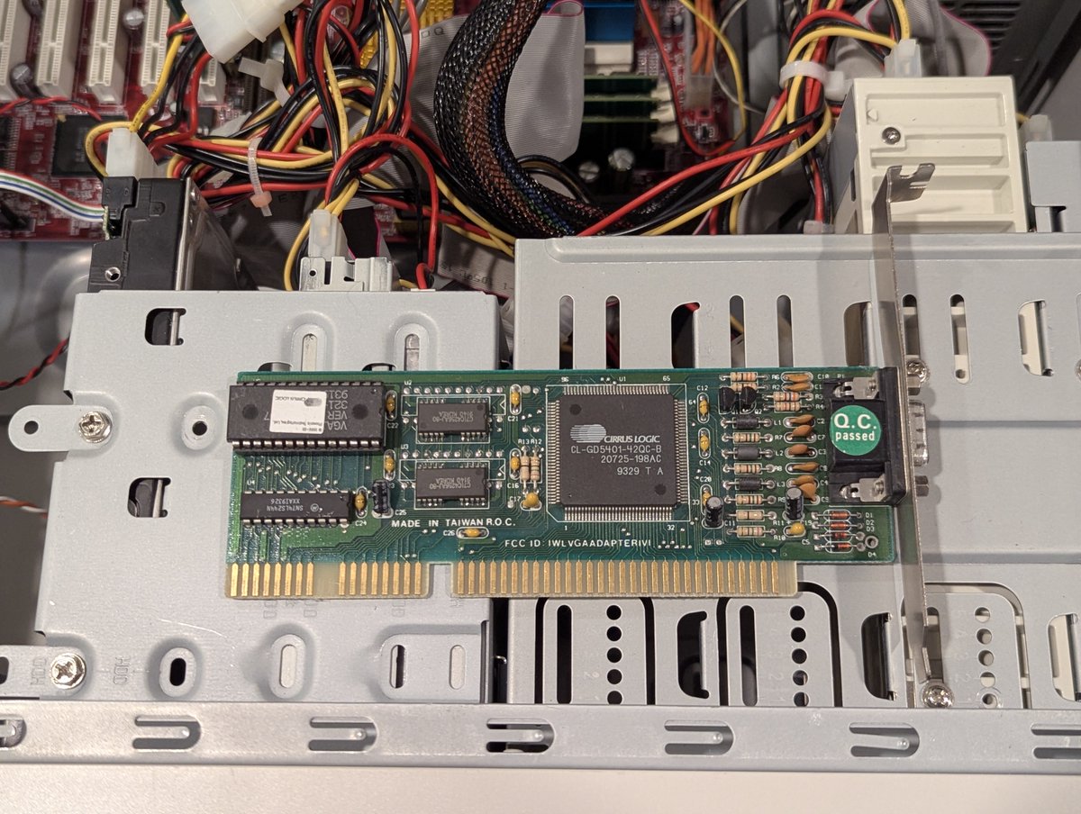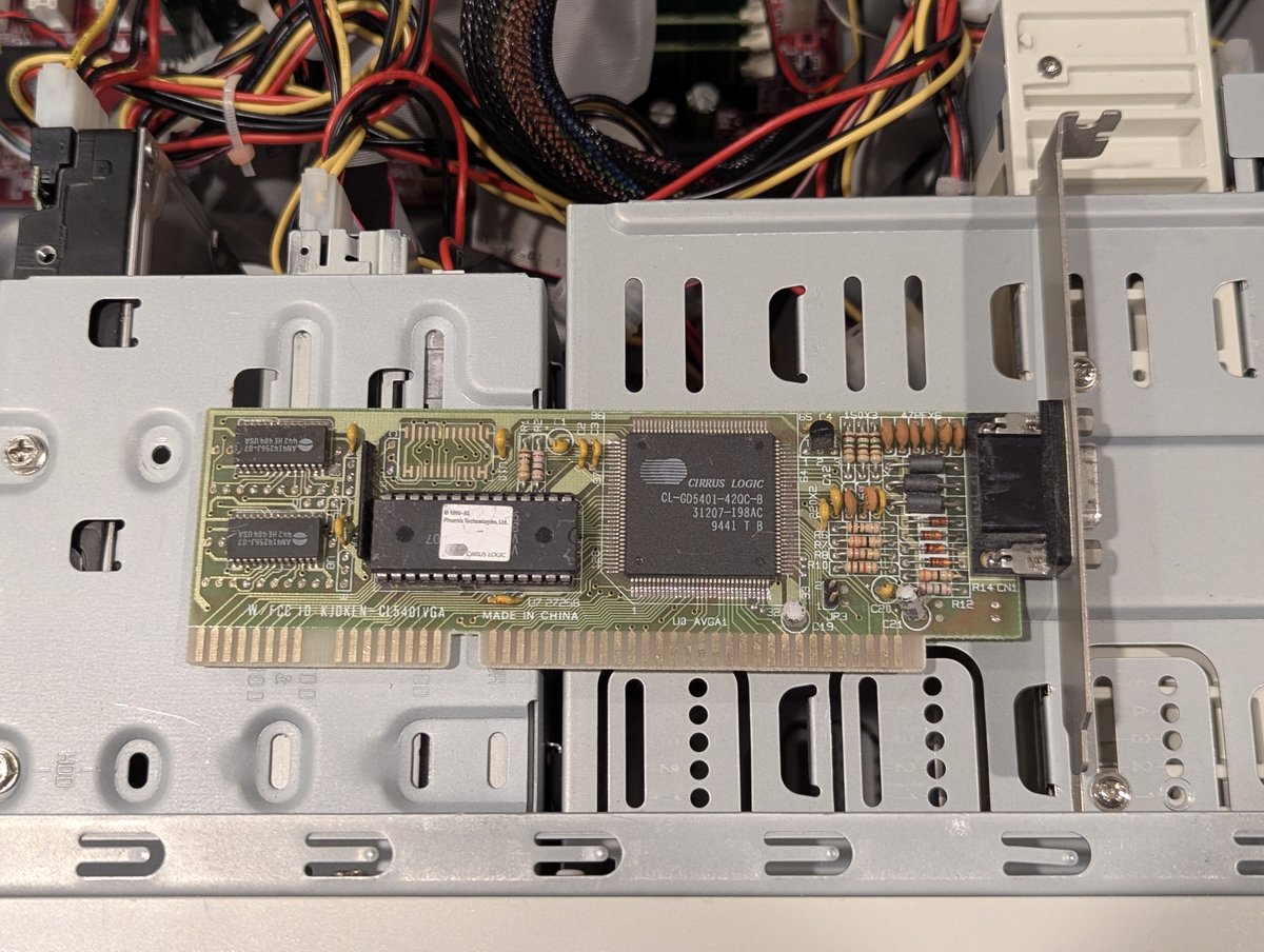 I have these two Cirrus Logic GD-5401 cards. Testing these in a Pentium III system feels wrong, we'll do it anyway. Look how slow the screen draws 😂. And the "snow" you see is the card attempting to go into an unsupported video mode. These cards are fine. Pass.