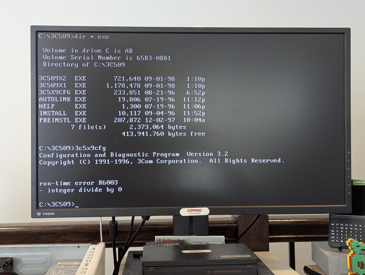 Alright, let's go. I need to choose a system that will support the networking for ELKS. Turning to the Wiki, as of right now, the network cards supported are NE1000, NE2000, Western Digital 8003, Western Digital 8013, and 3com Ethernet III (3c509). My 486 DX4 has a 3Com 3c509!