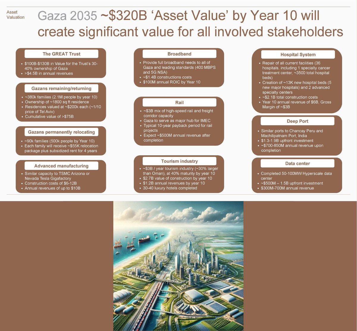 Housing: $35.3B in investment to build homes for ~2.1 million Gazans. Each home is pegged at ~$200K value, a tenth the cost of Tel Aviv real estate.