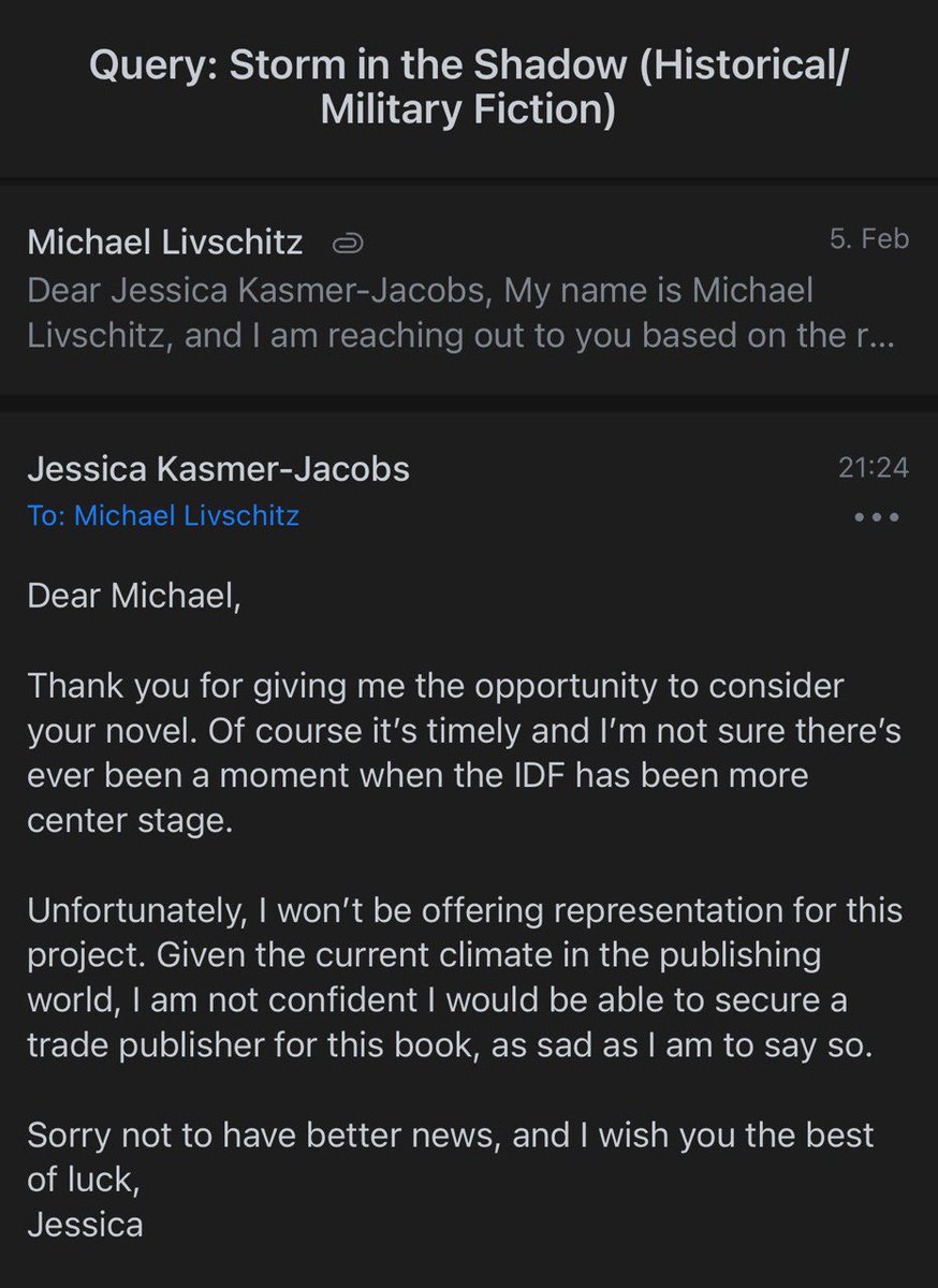 This October will mark exactly one year since I began sending queries to literary agencies to find representation for my novel Storm in the Shadow. Hundreds upon hundreds of emails resulted in a total of 215 rejections—perhaps more—some of them openly biased and at times aggressive. A novel centered on the IDF—on its recruits and on the history of Israel—was met with hostility and promptly rejected by the literary industry.