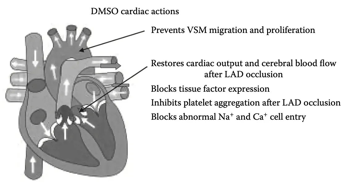 In rabbits fed cholesterol to induce atherosclerosis, DMSO reduced artery plaque by 30-40%.