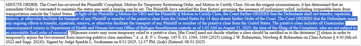 But useful to note that she was very explicit in her written order about prohibiting the removal of the unaccompanied minors--quite the opposite of Boasberg's "oral order" which he failed to document in a follow up written order, which is now the subject of litigation in his contempt claims against the Trump DOJ. (More on that later, too!)
