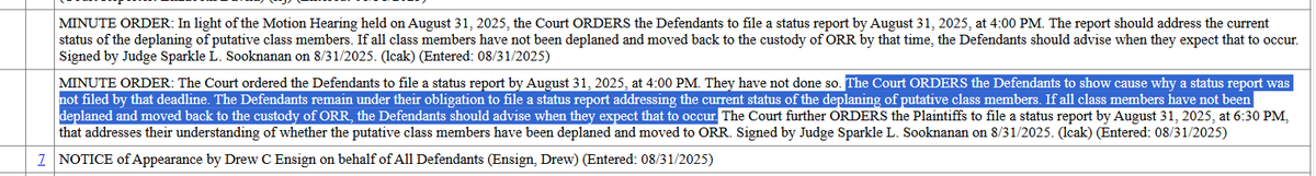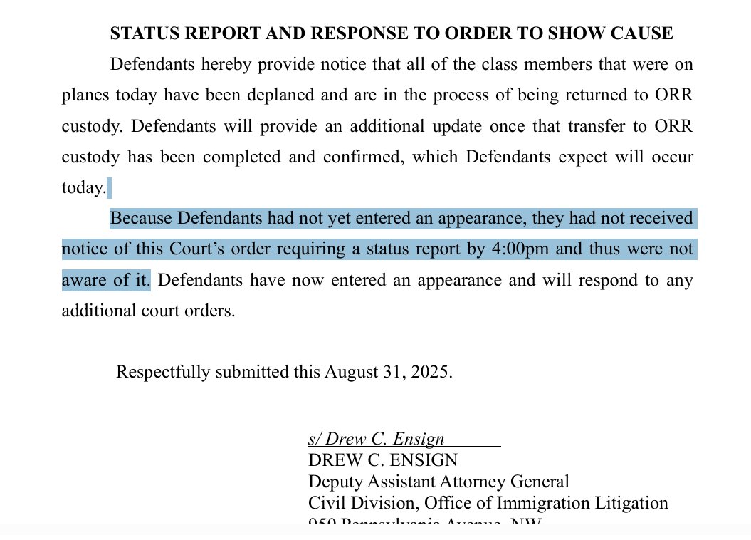 The DOJ attorney--the same one before Boasberg in the Alien Enemies Act litigation and the same one Boasberg has accused of contempt--had to inform Judge ✨why they hadn't yet filed a status report: