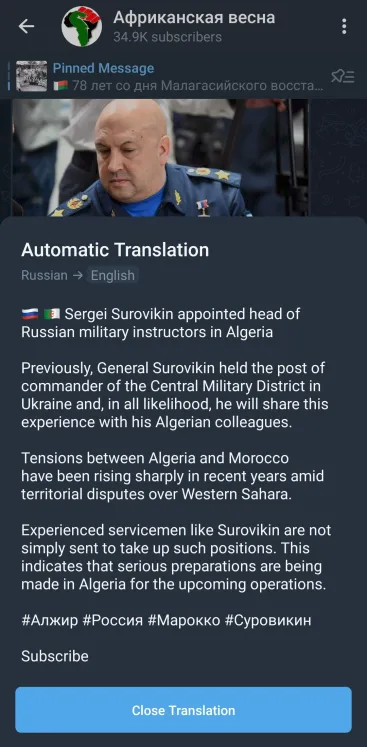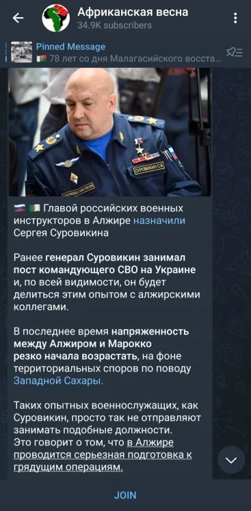 Le général d'armée Sergueï Vladimirovitch Sourovikine serait désormais à la tête des instructeurs militaires russes en Algérie. Sa mission consisterait à préparer les forces locales à un conflit contre le Maroc.