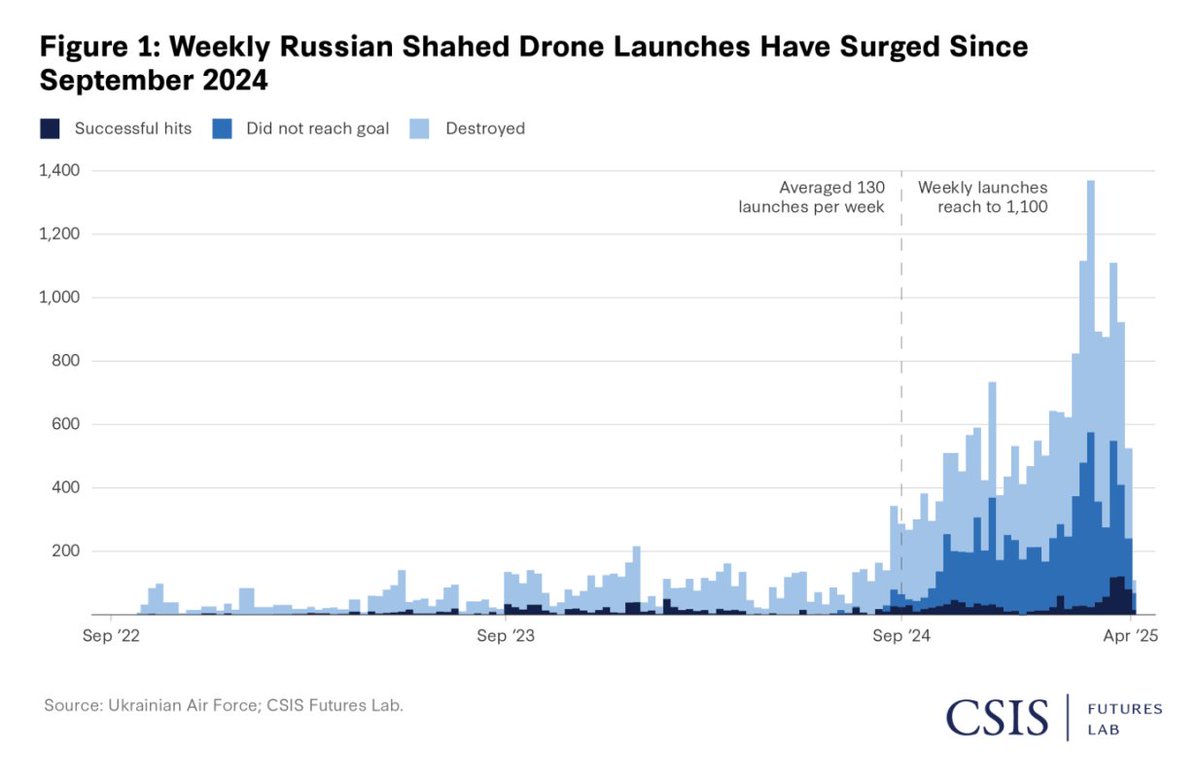 Elle remonte au début de l'invasion de l'Ukraine, et croît de façon exponentielle : le mois de juin 2025 représenterait 10% du total de 28 743 Shahed tirés par la Russie depuis 2022.