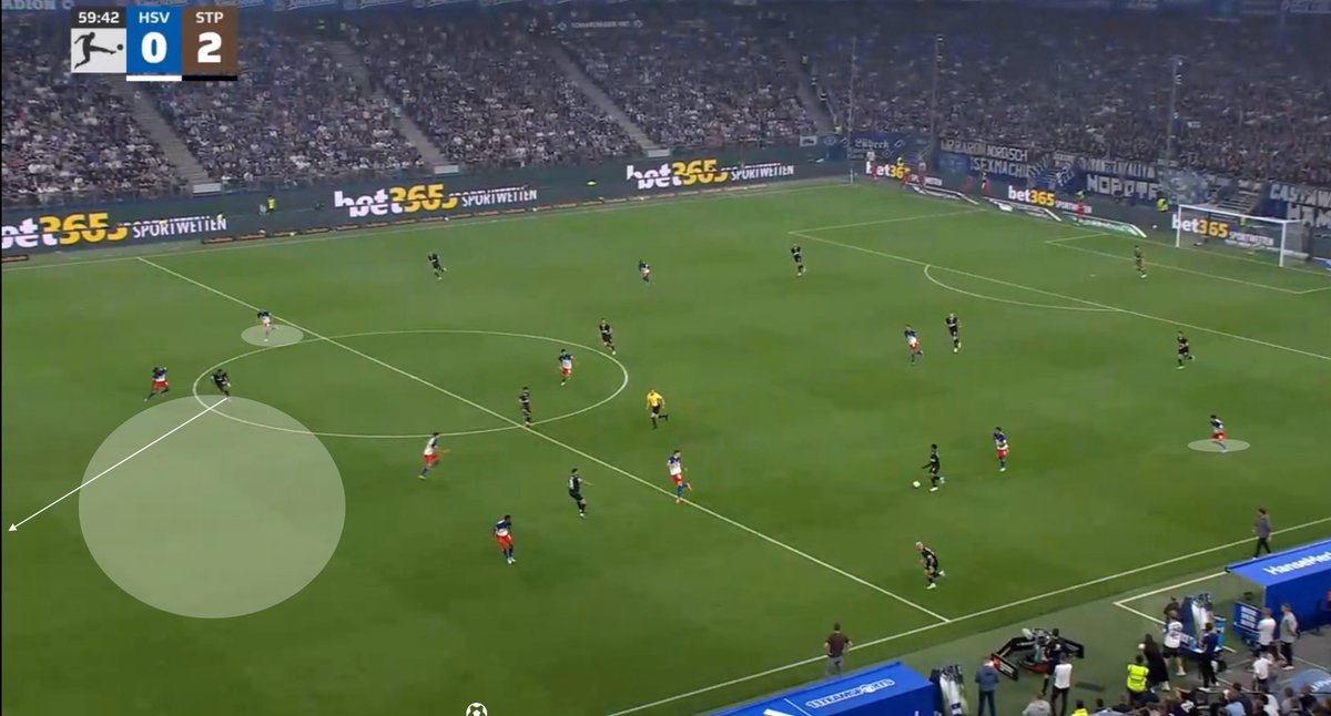2 of St. Pauli's WBs are aggressive in possession. They push high, create a 5 vs 5 situation against HSV back line.