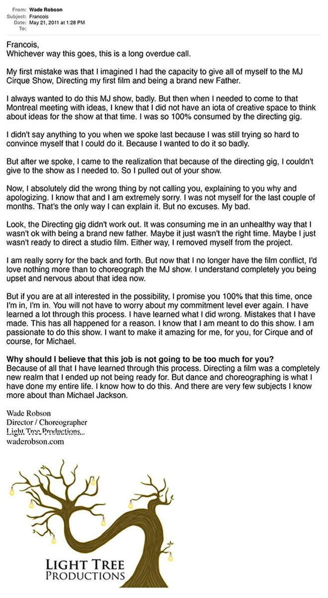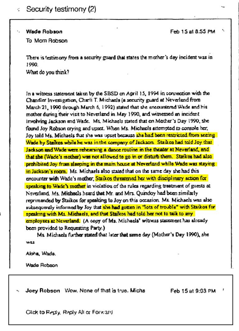 Robson claims his first lawsuit was dismissed as it was too late. But doesn’t state how he alleged he only learned about the Jackson estate in 2012, but emails reveal he was aware of its existence earlier. (Look at the date of email) Image
