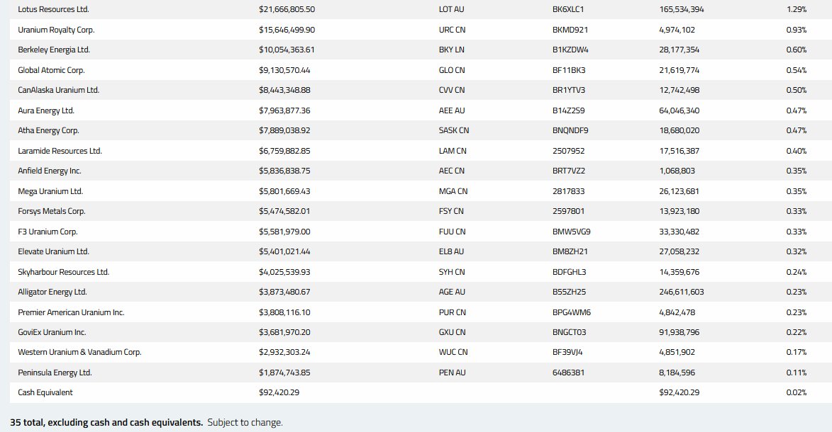 3)🐳World's largest & most liquid #Uranium ETF with over $4 Billion AUM💰 is from Global X but is weighted at only 70% Uranium #stocks⚠️ with remaining 30% for #Nuclear component makers⚛️🏭 & generic miners⛏️ at ticker $URA 🇺🇸 also offered as $URNU 🇬🇧 and $ATOM 🇦🇺 🤠🐂🧵👇.../4