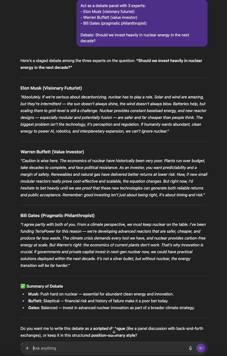 Act as a debate panel with 3 experts: a skeptic, an optimist, and a pragmatist.
