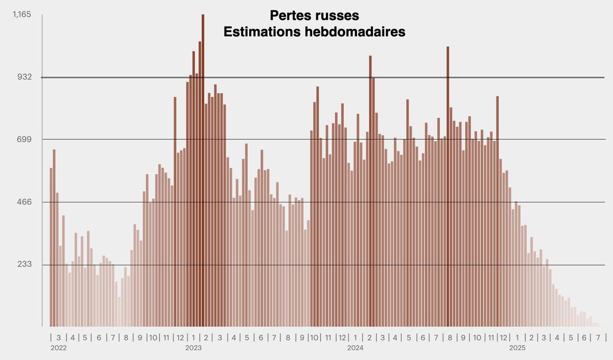 III Les morts journaliers/hebdomadaires russes sont en train de décroitre fortement depuis mars 2025 et sont désormais minimes. On est loin des 400k à 500k cités communément sur @LCIPolitique #BFMTV @CNEWS @DariusRochebin