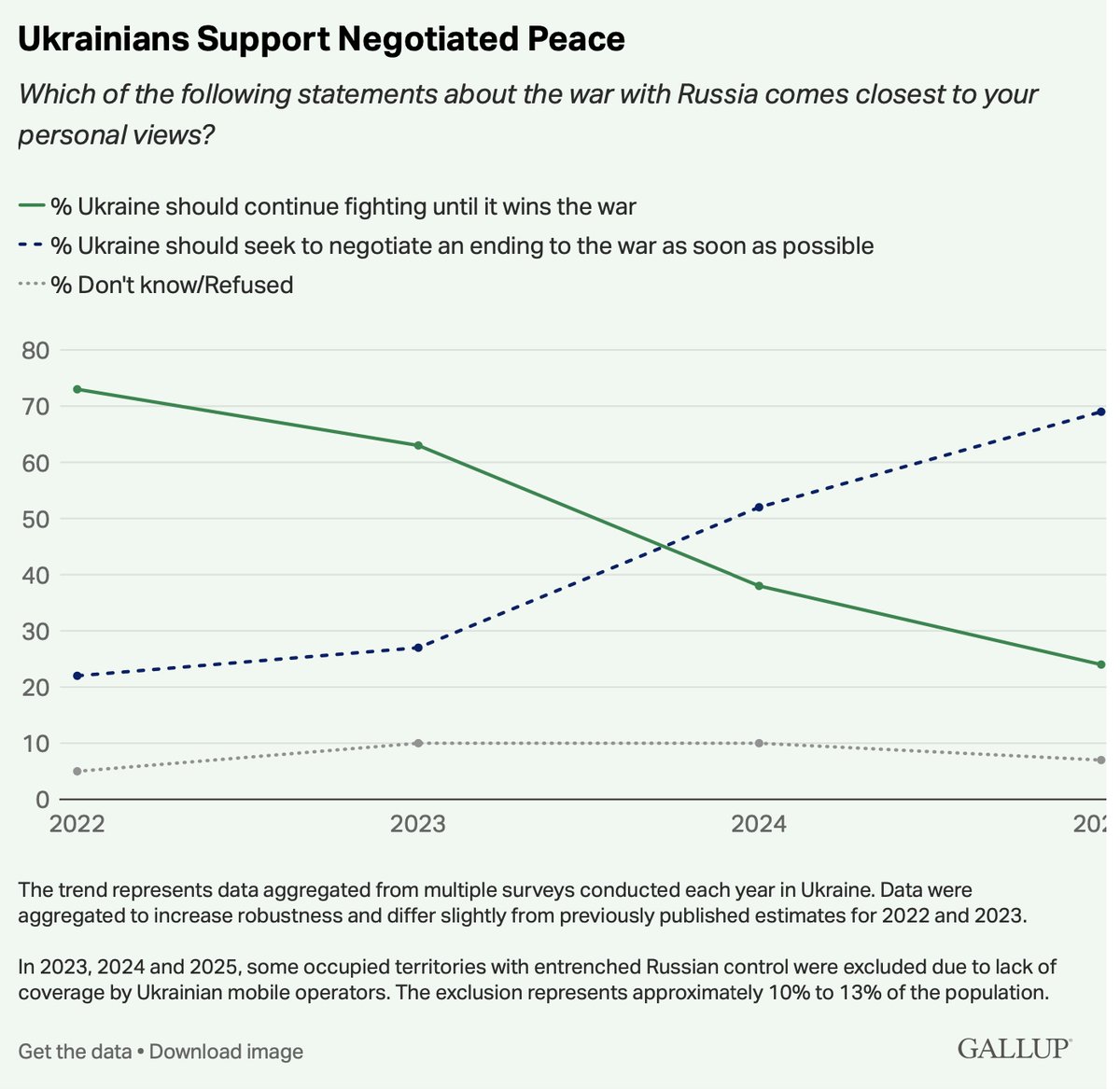 2 L’effondrement du soutien à la guerre est évident à partir de 2024 et devient largement majoritaire (70%) en 2025. Mais, même en 2022 22% des ukrainiens étaient opposés à la guerre et souhaitaient des négociations de paix