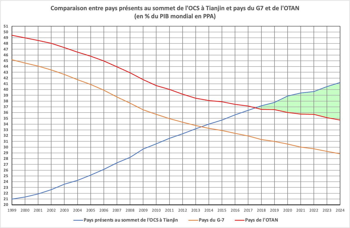 II En fait ce sommet a réuni de nombreux pays autour de la Chine de l'Inde et de la Russie, pays totalisant près de la moitié de la population mondiale et 41% du PIB mondial en PPA