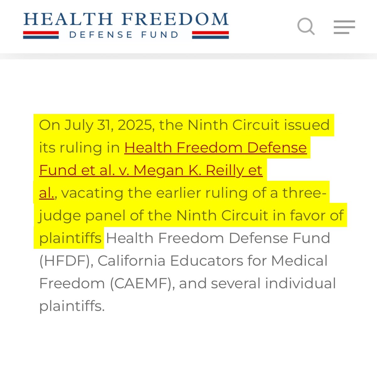 On July 31, the Ninth Circuit issued its ruling in Health Freedom Defense Fund et al. v. Megan K. Reilly et al. vacating an earlier ruling in our favor.