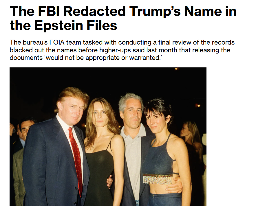 On Friday, Bloomberg did some great reporting that the DOJ & FBI seem to be *illegally* misusing FOIA exemptions to hide Trump's name in OVER **100,000** pages of the Epstein files.