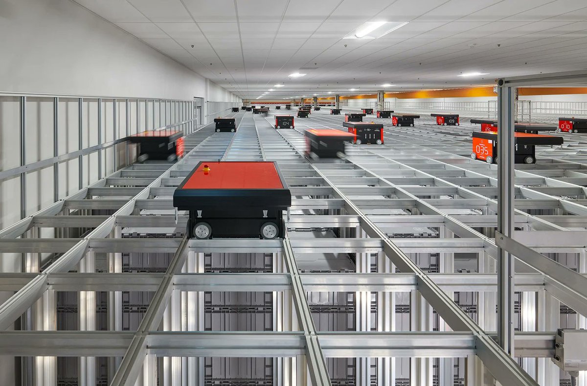 The dense warehouse has so much physical evidence that it uses ceiling robots to move and store the large crates.