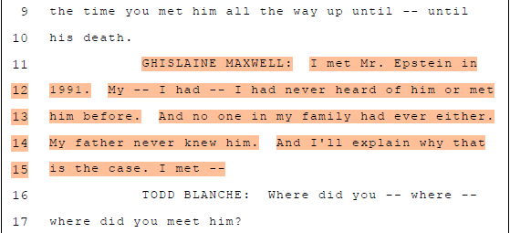 Maxwell claims she met Epstein in 1991, after the death of her father.