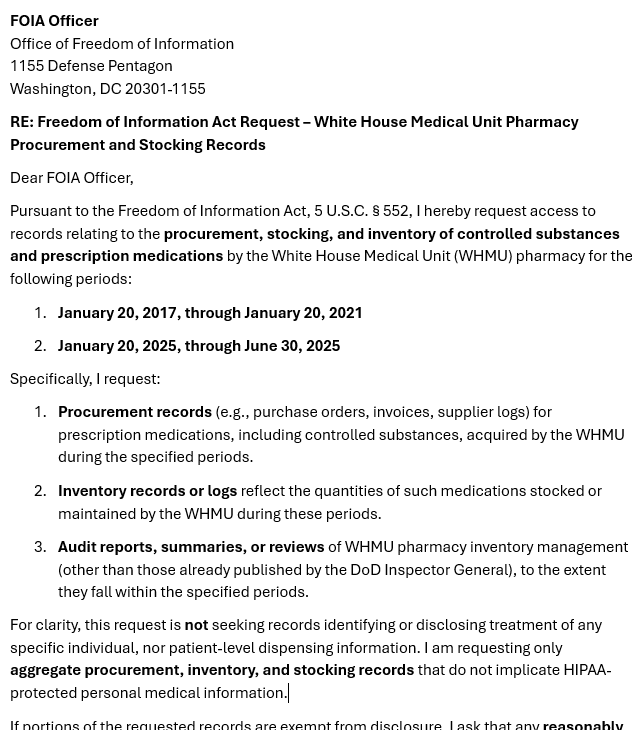 I'm filing a FOIA request with the Department of Defense, over the White House pharmacy records.