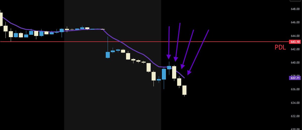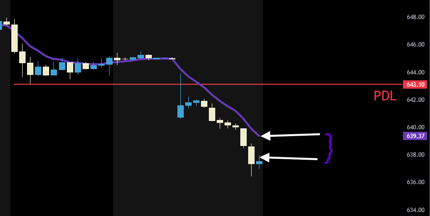 The market gapped down 1.5% the smaller time frames are printing FALSE signals using the π£ line rules. We have to use a higher time frame like the 30m. We can see there is an extension fill brewing off the open, perfect for shorts to cover and for us to short.