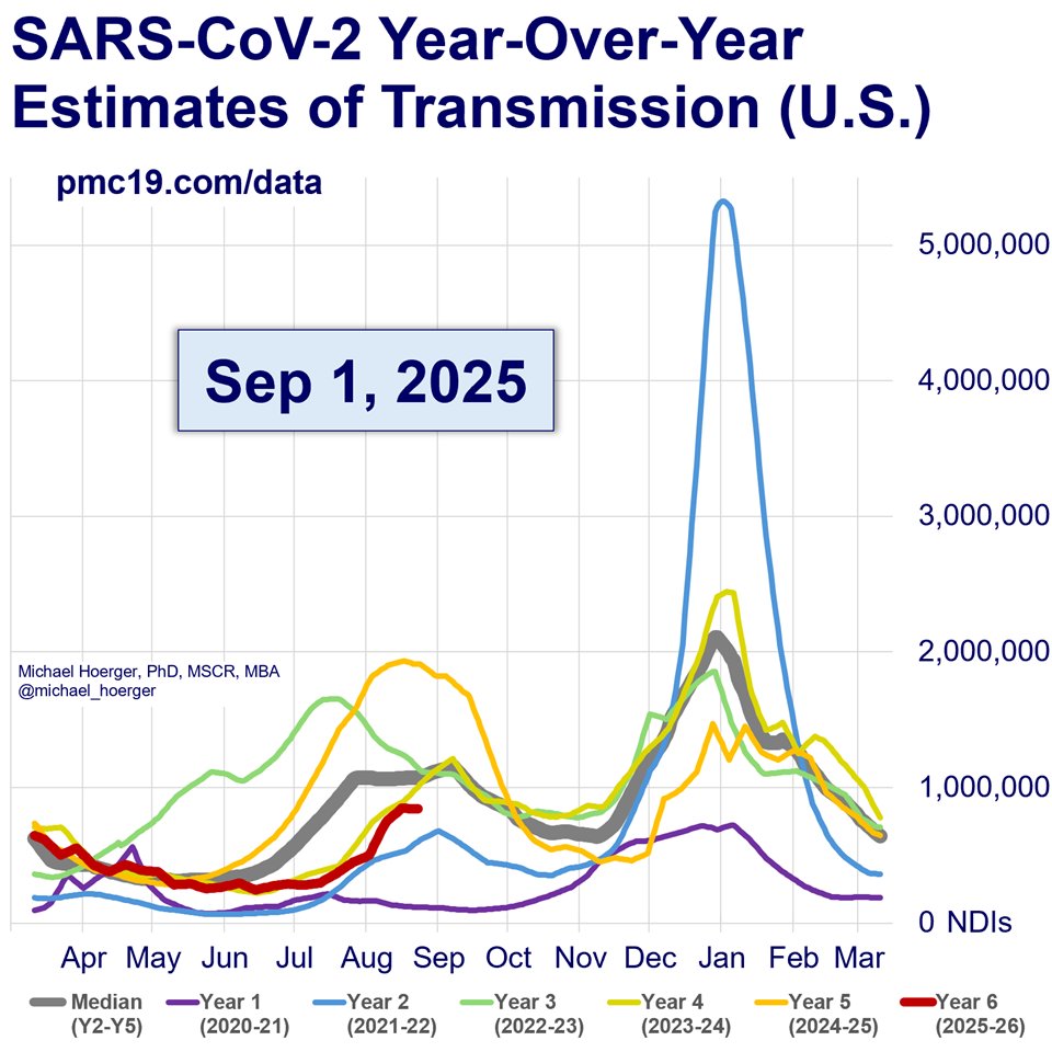 If the CDC retroactively corrects the most recent real-time data upward, which is plausible, we could head toward 1.2-1.5 million new daily infections. If the numbers hold, the peak will be closer to 0.9 to 1.0 million new daily infections and occur around Sept 6. Significant transmission occurs on the back end of waves. Most people won't even realize we're in a wave until mid to late September.