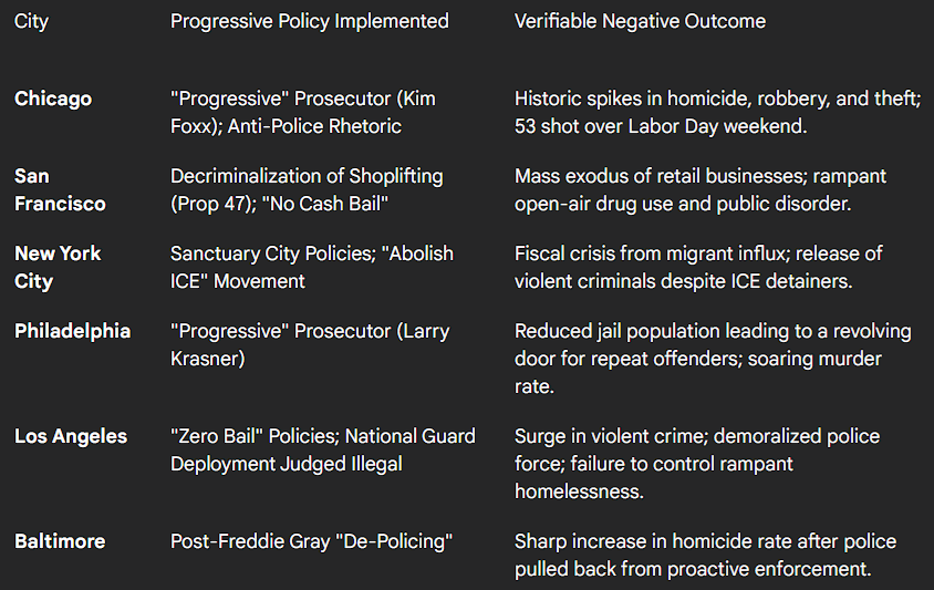 The following table provides a clear, data-driven indictment of the progressive urban experiment. It connects specific, radical policies with their catastrophic and verifiable consequences in key Democrat-run cities, offering an irrefutable summary of this report's central thesis.