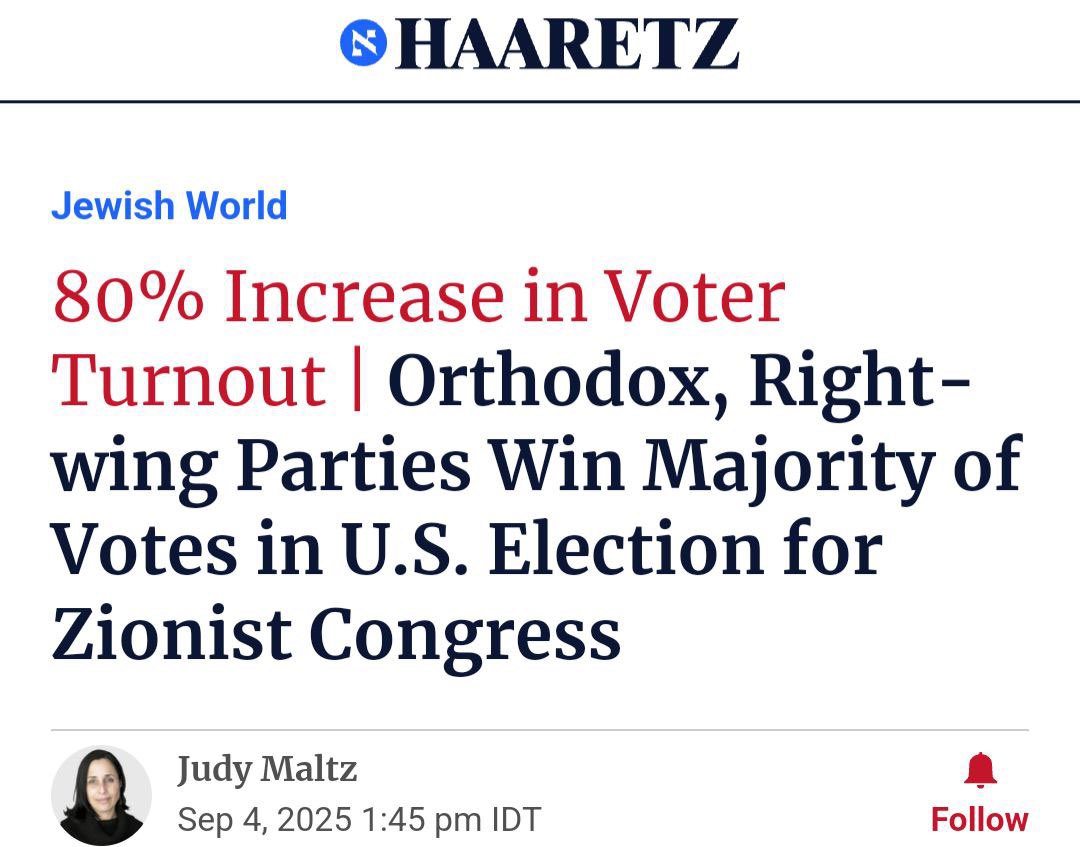The latest U.S. election for delegates to the World Zionist Congress, the self-proclaimed “parliament of the Jewish people” and the body that controls billions in resources for the Zionist project, has ended with Orthodox and hardline right-wing factions tightening their grip.