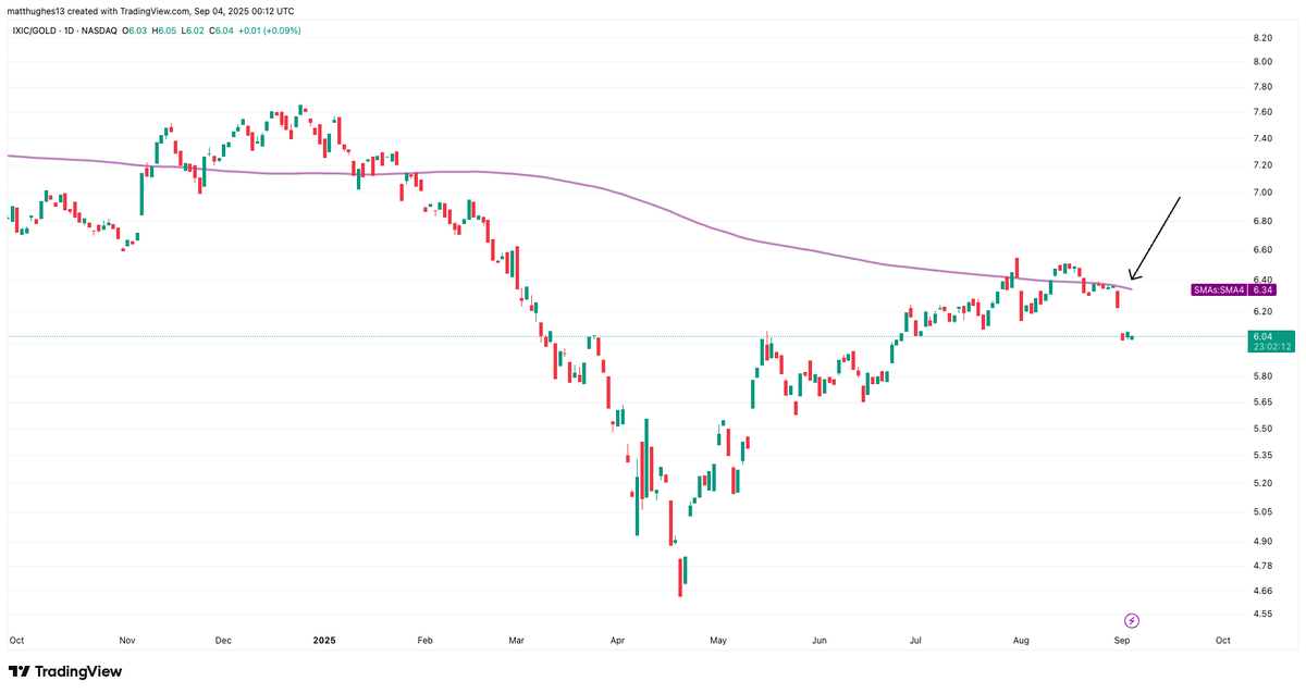 7/ Forecasts see gold pushing to $4,000 by year-end, but ratios like Nasdaq ( $IXIC) priced in #GOLD are rejecting at the 200day MA, hinting at a top and rotation back to stocks. Platinum and palladium are already breaking out vs. SPX, signaling a broader metals shift—but for gold, this could mean peaking as investors rotate to higher-growth assets. Tokenized gold on chains like XRPL, Stellar, and XDC adds on-chain diversification, but the real play is liquidity flowing elsewhere.