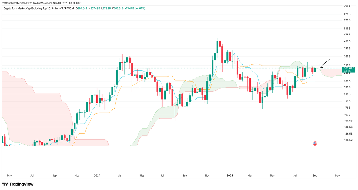4/ Shifting to crypto: Altcoins are starting to break higher, a classic risk-on indicator. We're seeing spikes in futures open interest, heavy leverage rotating in, and predictions of explosive gains. $OTHERS is also almost ready to break through the weekly cloud