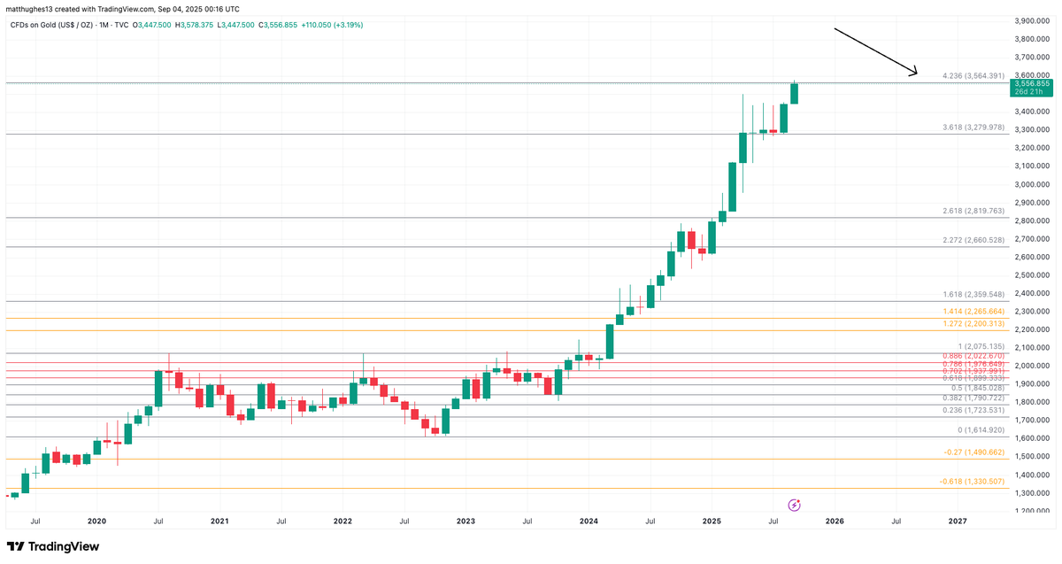 8/ #GOLD also hit the full extension today of the 2020 high and 2022 low. Hitting the full extension of the 4.236 is definitely a zone to be cautious in