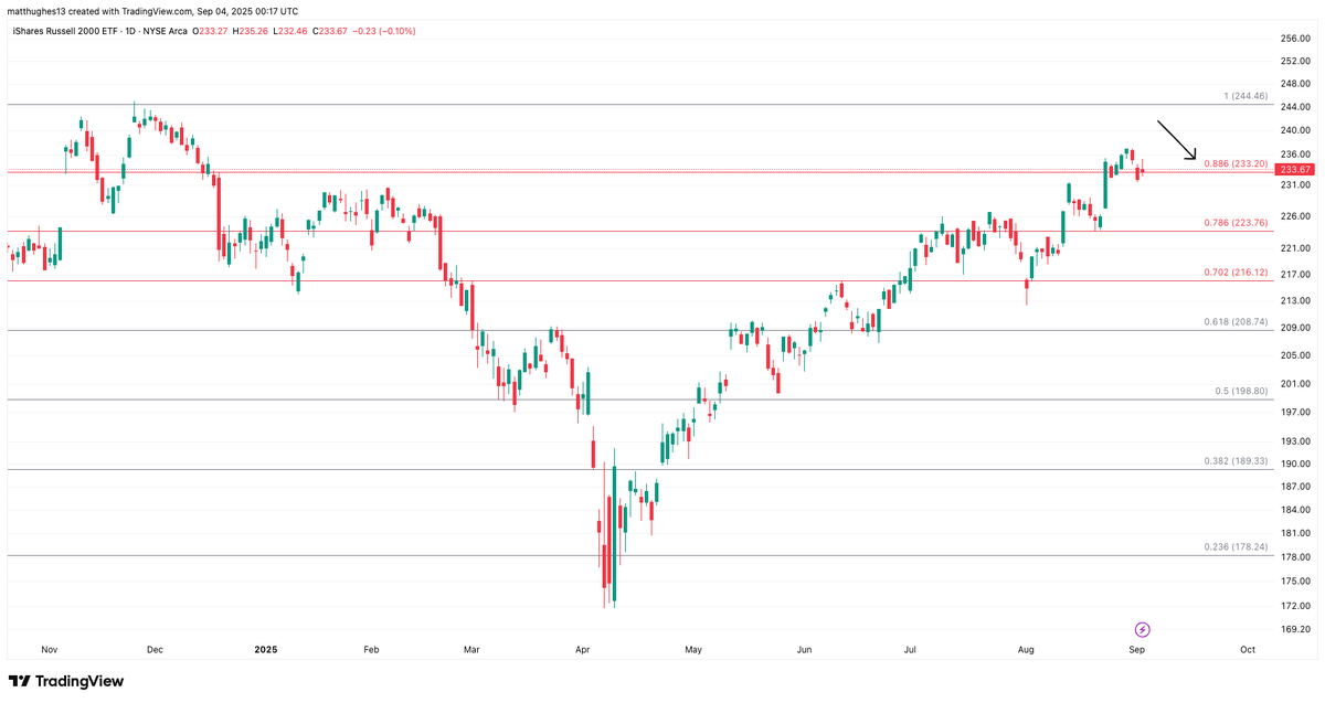 2/ First up: $IWM, the iShares Russell 2000 ETF tracking small-cap stocks. This bad boy has been consolidating for years, but recent action screams breakout. After underperforming for much of 2025, it's now holding above key levels like the 88.6% Fib retracement around $233.20, with eyes on $245 and beyond. The Fed's hints at rate cuts are turbocharging this—lower rates mean easier capital for speculative small caps, which make up the bulk of the Russell 2000.